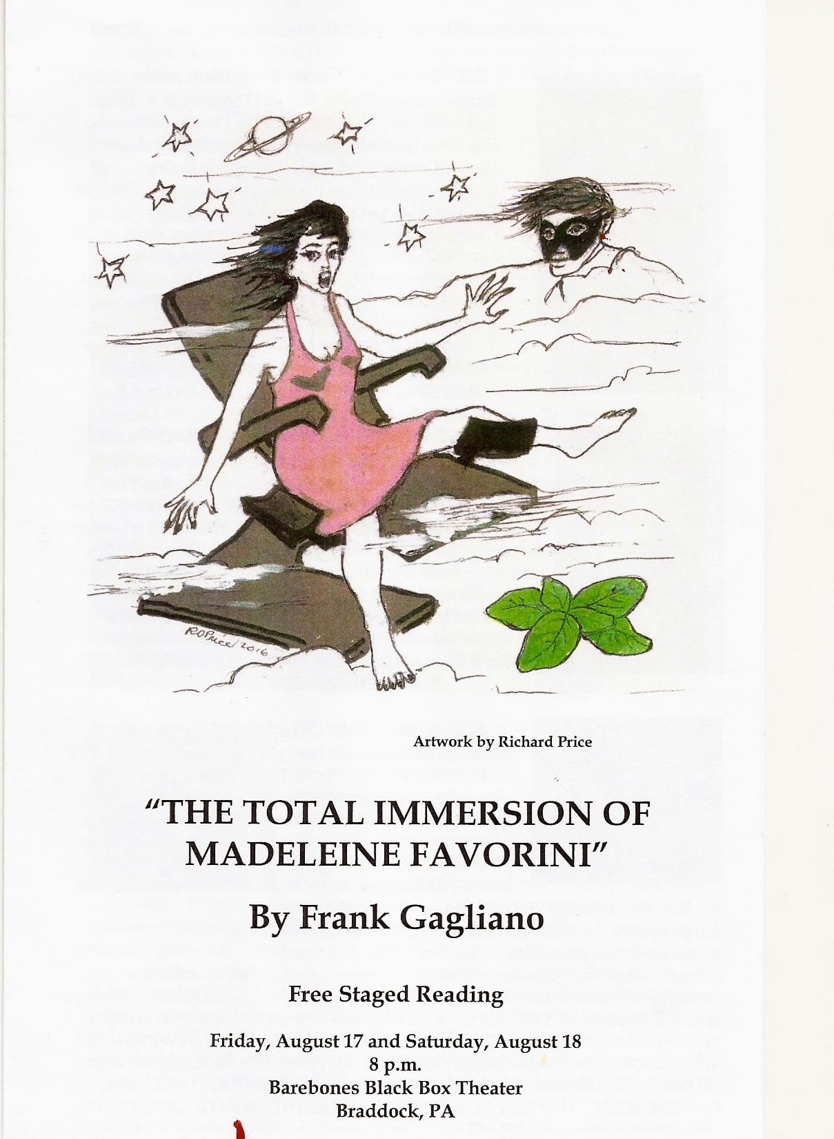THE TOTAL IMMERSION OF MADELEINE FAVORINI is noted for long spoken arias (including the soaring “vacuum vagina” speech) filled with lyricism and images; and for its outrageous humor, painful discoveries and theatrical encounters.